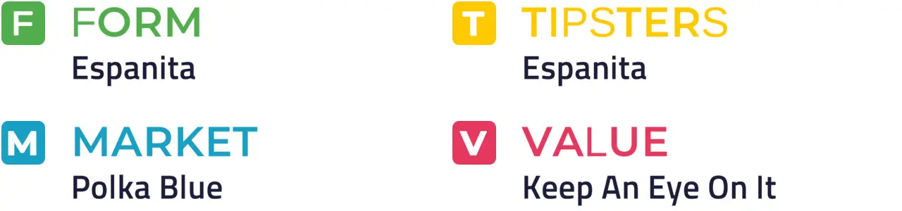 Specific Pace Hint: Espanita could be advantaged by a prominent position which looks likely in this field: Of the better-fancied horses, Polka Blue is most likely to be ridden furthest from the pace.